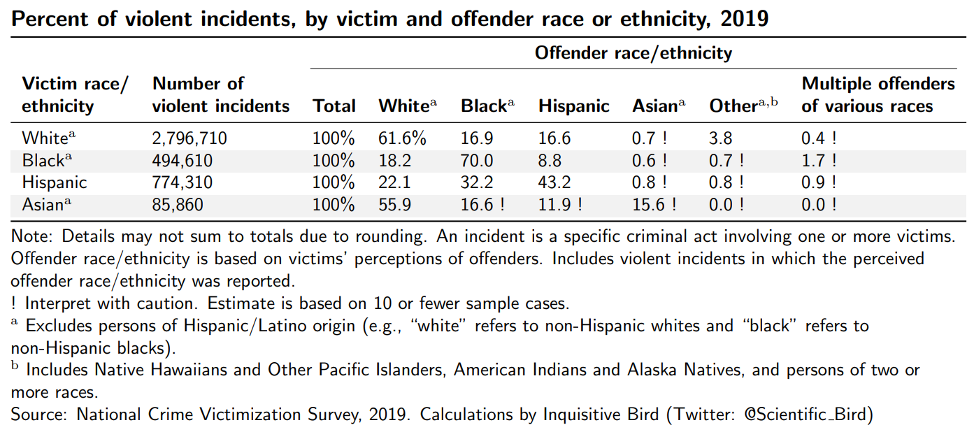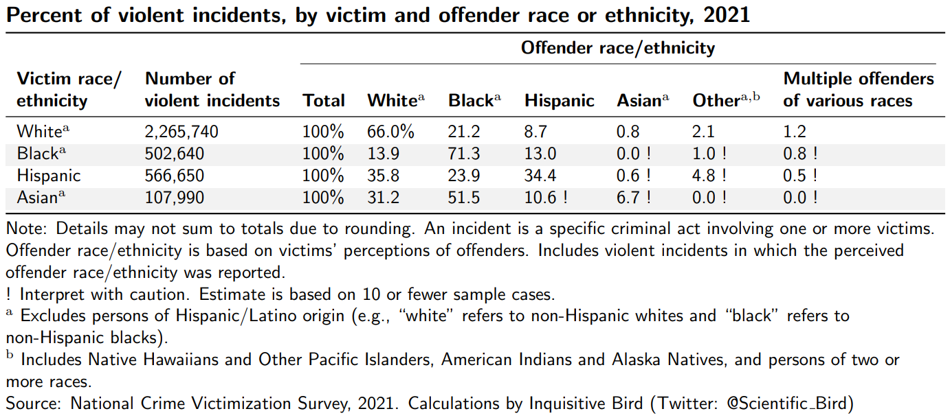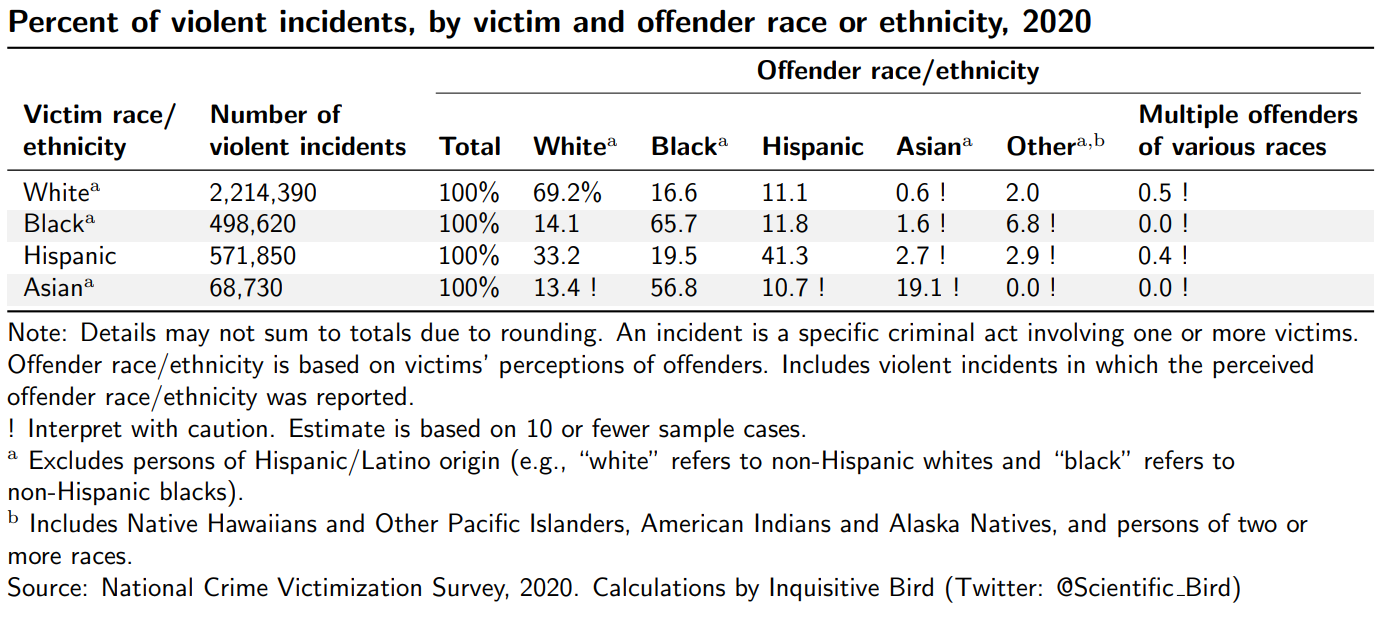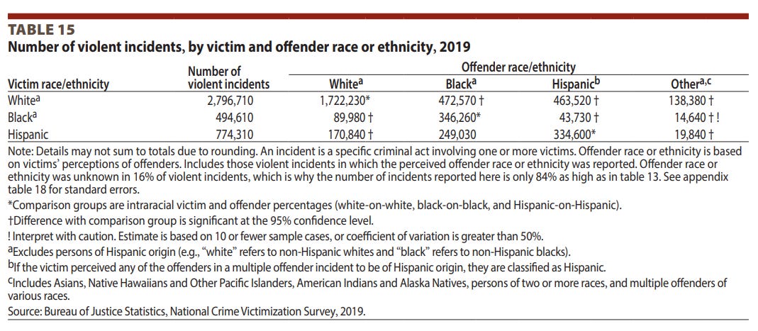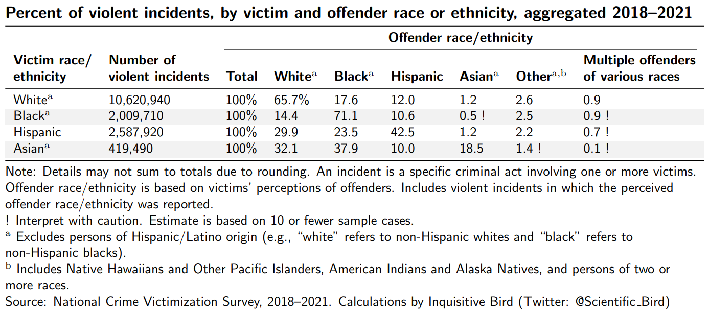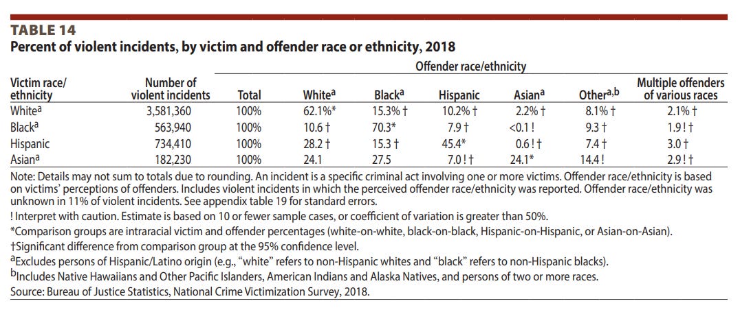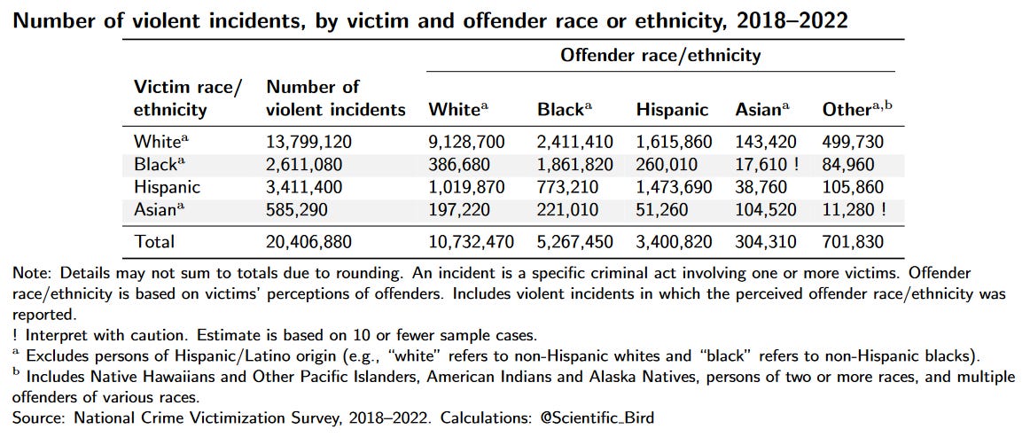 The report from the following year has a similar table, just stated in terms of estimated number of crimes rather than as percentages (see below). But note that Asian as a category is missing in the table. And in the year following that, in “Criminal Victimization, 2020”, the table did not even exist. In the most recent report, the table is included again, but Asian as a category remains left out. I think there are plausible innocent reasons for leaving them out1, but I still think it is worth showing.