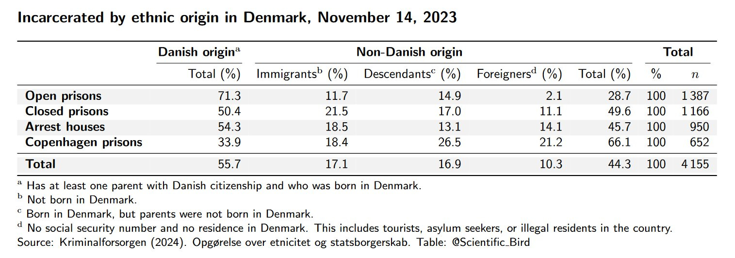Non-natives are also overrepresented in Danish prisons. A recent analysis showed that 50.4% of those in closed prisons had Danish origin, and just 33.9% in Copenhagen prisons. For context, in 2023Q3, people of Danish origin represented 84% of the national population and 72% of the Copenhagen population.