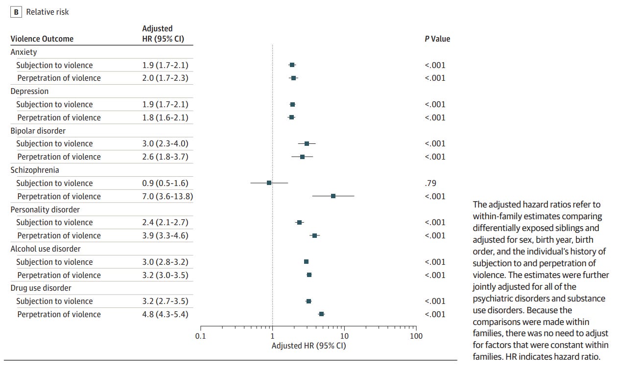 A Swedish nationwide cohort study finds that people with psychiatric disorders are approximately 4 times more likely to perpetrate violence than their siblings without psychiatric disorders. The hazard ratios for various psychiatric disorders can be seen below. For internalizing disorders (anxiety and depression disorders) it is around 2, for externalizing disorders (e.g., substance use disorders) it is closer to 4, and for schizophrenia even higher. Considering even more serious violence, a review analyzing evidence from multiple countries found that people with schizophrenia commit homicide at rates almost 20 times higher than those without.
