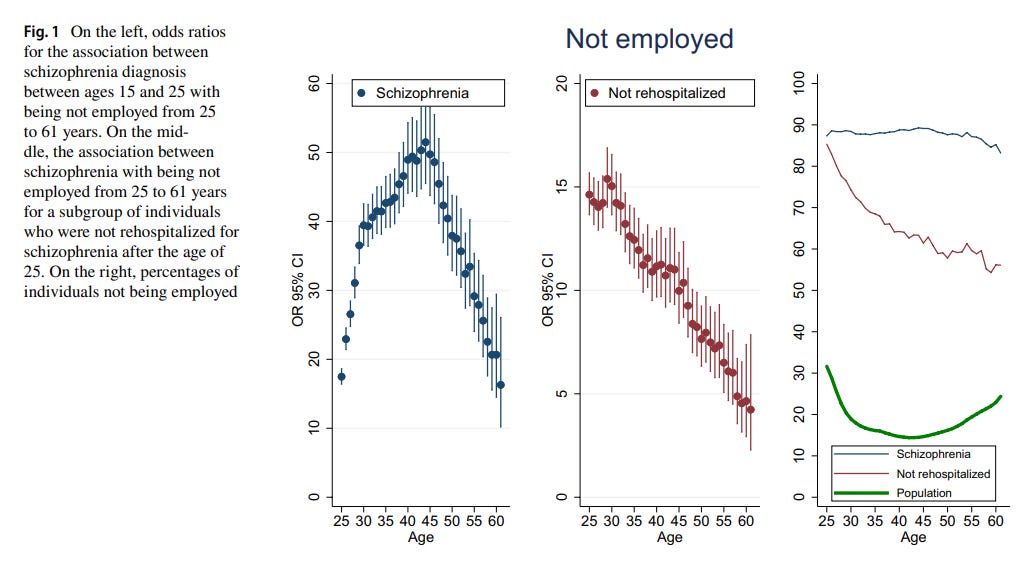 Mental disorder is a great burden for the people who suffer from them and for society. People with mental disorders often struggle in the labor market. The burden differs between kinds of mental disorders and with the severity of the symptoms experienced, but few are as illustrative as schizophrenia. A Danish nationwide cohort study looked at the association between early-onset schizophrenia and various life outcomes. They found that an astonishing 85-90% were not employed between the ages 25-61, an odds ratio of unemployment reaching a value of 50 at the general population’s prime working age. Simply put, effect sizes of this magnitude are practically never seen in the social sciences. The same study also found that, between the ages 25–61, their cumulative earnings were on average a mere 13.6% (less than one seventh) the amount of that of people who were not diagnosed with schizophrenia.