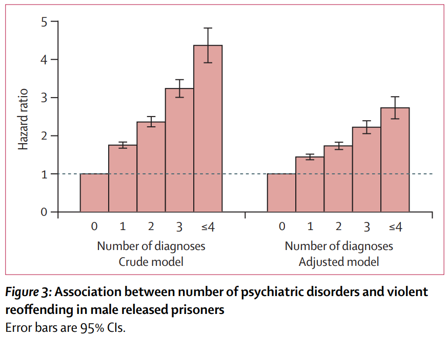The modestly higher rates of violence for internalizing symptoms can likely be mostly explained by substance abuse. A recent large study of individuals with community sentences found that those with psychiatric disorders were more likely to violently reoffend. However, for internalizing disorders such as depression and anxiety, most of this disparity is gone in cases without substance abuse. The higher rates of violent reoffending among people with psychiatric disorders have been found in other earlier studies. They also find that the reoffending rate increases with the number of diagnoses (see below).
