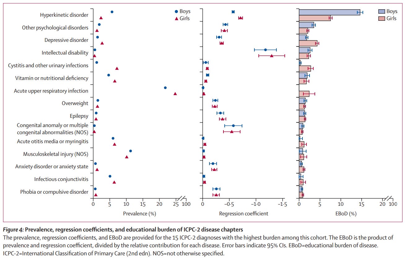 As noted in some of the studies above, the effects of mental disorders are also observed in educational performance. A large Norwegian cohort study estimated the educational burden of disease (EBoD) based on grade point average (GPA) at the end of the compulsory school aged circa 16. They compared siblings from the same family where one was affected by the illness and the other wasn’t to estimate the average absolute effect of the disease on GPA (see image below). Overall, mental health disorders accounted for nearly half of the overall disease burden. When affected, the largest effect by far was for intellectual disability, a testament to the importance of intelligence in education. However, due to their much greater prevalence than intellectual disability, hyperkinetic disorders (notably including ADHD) have the largest aggregate society-wide burden of all disease categories. Large Danish and Finnish studies have found similar results for the effect of mental illness on GPA, likelihood of reaching final grade examination, and on the risk of being long-term not in education, employment or training.