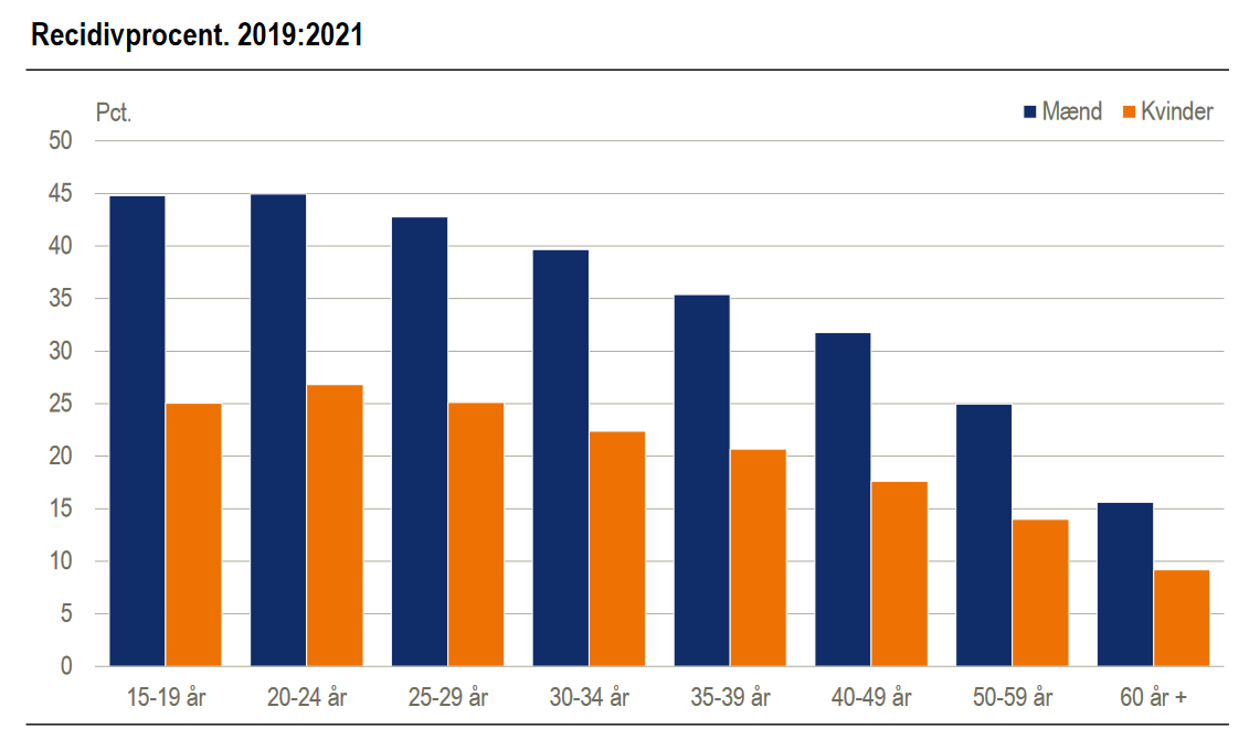 Consider for example the recidivism rate by age in Denmark, for men (“mænd”) and women (“kvinder”), respectively. Source: Statistics Denmark (2023).