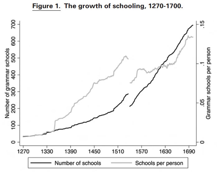 More generally, schooling increased at least since the 13th century as illustrated for England below. This increase was both in terms of the raw number of schools, but also in terms of schools per capita (Pleijt, 2020). The average time spent in education also rose (Pleijt, 2018).