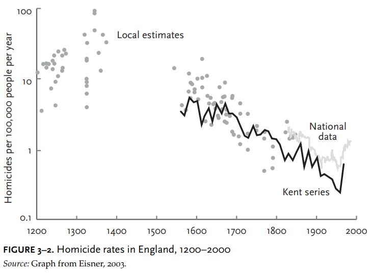 Another trend concurrent with the West’s ascension was not a rise but a fall in violence. At least starting from somewhere between 1400 and 1500, rates of interpersonal violence started falling dramatically, especially in Northwest Europe. Places such as England and Germany started falling early, whereas places like Italy and Scandinavia seem to have transitioned somewhat later. The overall drop in interpersonal violence in West Europe has been confirmed with multiple sources of data.9 Below is an illustration of the falling homicide rate in England, 1200–2000.
