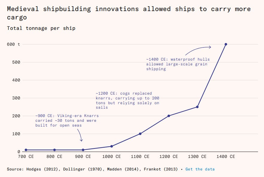 Another domain of technological advancement was that of seafaring, ultimately culminating in the Age of Discovery. The chart below illustrates how innovations made it possible for medieval ships to carry much more cargo. Navigation ability was also improved through various innovations.