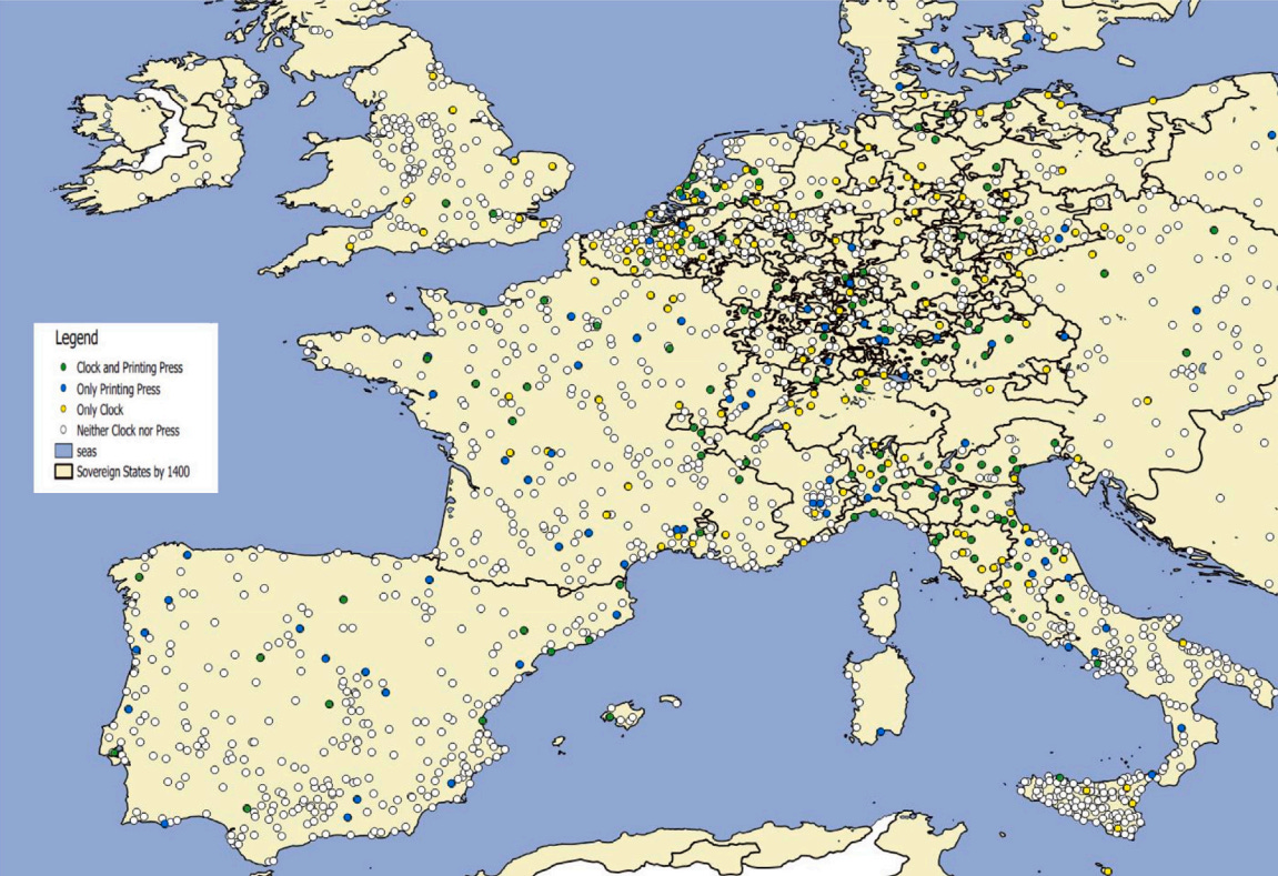 The two most important and complex technologies of the late medieval period are arguably Gutenberg’s moveable-type printing press and the public mechanical clock. Boerner et al. (2021) document the diffusion of these technologies throughout Europe, as can be seen below. Early adoption was most widespread in wealthier areas, such as the Low Countries, northern Italy and Germany. While Europe put these technologies to use, Gutenberg’s movable-type printing press was famously blocked by religious authorities in the Islamic world, arguably of great importance to the divergence between West Europe and the Islamic world.7