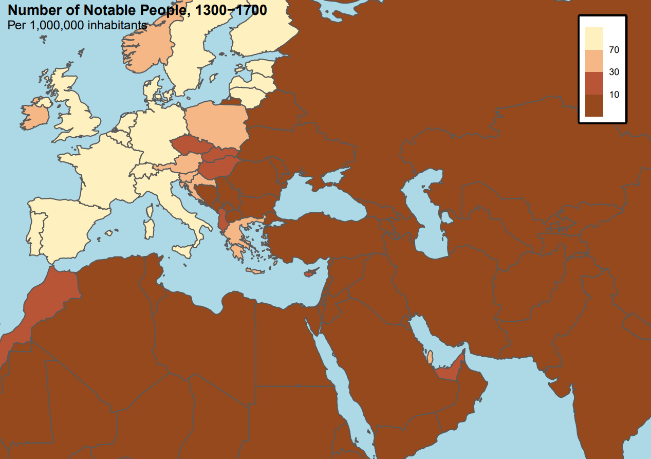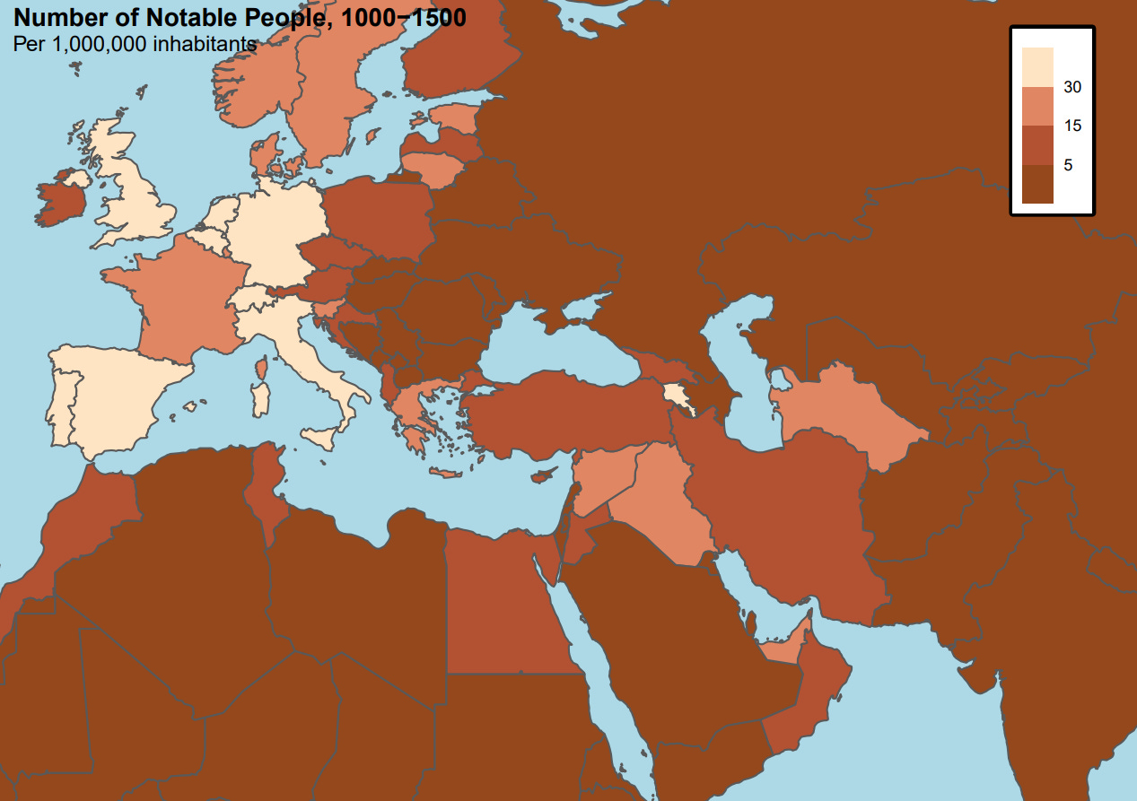 In the period between 1000 and 1500 A.D., the relevant major civilizations were West Europe, the Islamic world, India, and China. Below I have illustrated the notable people per-capita rates for countries accumulated over the 1000–1500 period. I have focused on the region containing Europe and the Middle East as, with respect to this measure, they are the only real competitors in this period.3