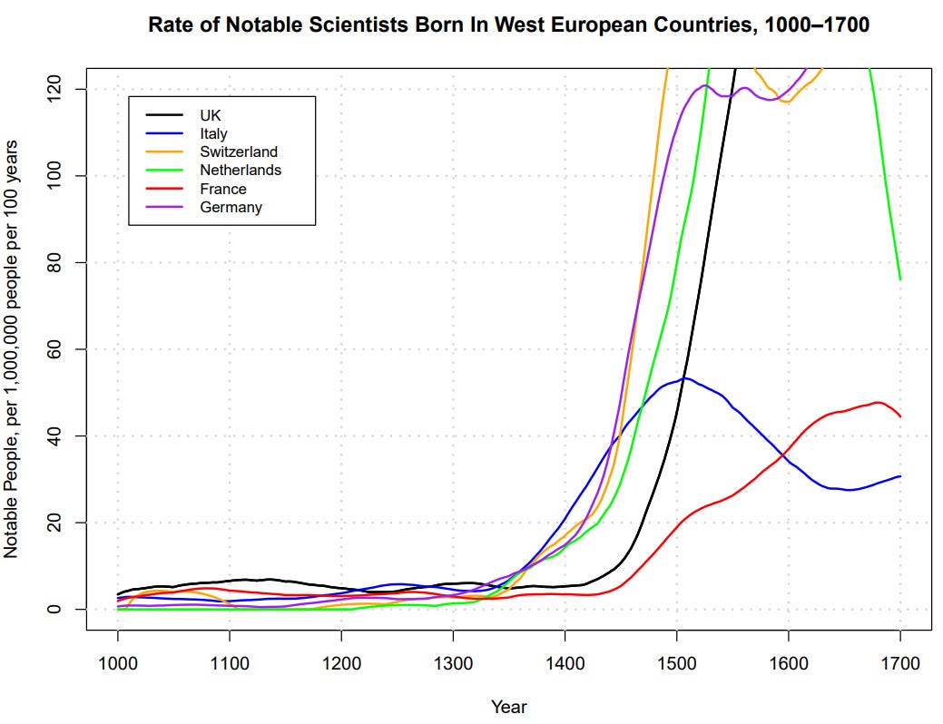 The divergence I observe in the data of notable people of science, starting from approximately 1300 A.D., seems tightly connected with the so-called “Little divergence” (Pleijt & van Zanden, 2016), i.e., the “process [between 1300 and 1800] whereby the North Sea Area (the UK and the Low Countries) developed into the most prosperous and dynamic part of the Continent.” Starting in a similar period and in similar places (e.g., the Netherlands and the UK), I observe an especially great increase in per-capita rates of notable people of science.