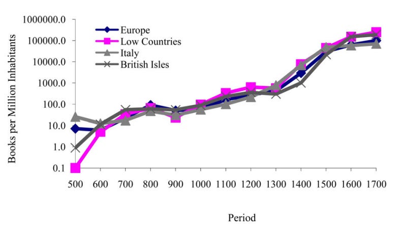 Buringh & Van Zanden (2009) have documented a great rise in manuscript and book production that occurred in Europe during the Middle Ages and beyond. It should come as no surprise that book production rose and book prices fell greatly after Gutenberg’s printing press. However, it is worth noting that even in the preceding centuries, book production in Europe was growing at a high rate as illustrated below. Between the 6th and 14th century, prior to the printing press, the estimated per-capita rate of book production increased between 50 and 100-fold in West Europe (Buringh & Van Zanden, 2009; Table 3). After the printing press, it increased even more rapidly. Because of the logarithmic axis, what visibly looks roughly like a linear trend actually represents an exponential increase in per-capita book production over time. The authors note that universities, monasteries, and urbanization together statistically explain almost 60% of the variation in per capita book production during the Middle Ages.