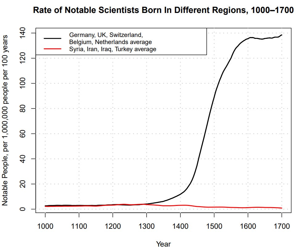 In the period 1000-1300, by this measure, these West European countries (Germany, UK, Switzerland, Belgium, Netherlands) produce on average 3.18 notable people of science per 1,000,000 people per 100 years. The Islamic countries (Syria, Iran, Iraq, Turkey) produce 2.88; China 0.19; and India 0.05. In the period before 1000, I find that the Middle East produces notable scientists at higher rates than West Europe.