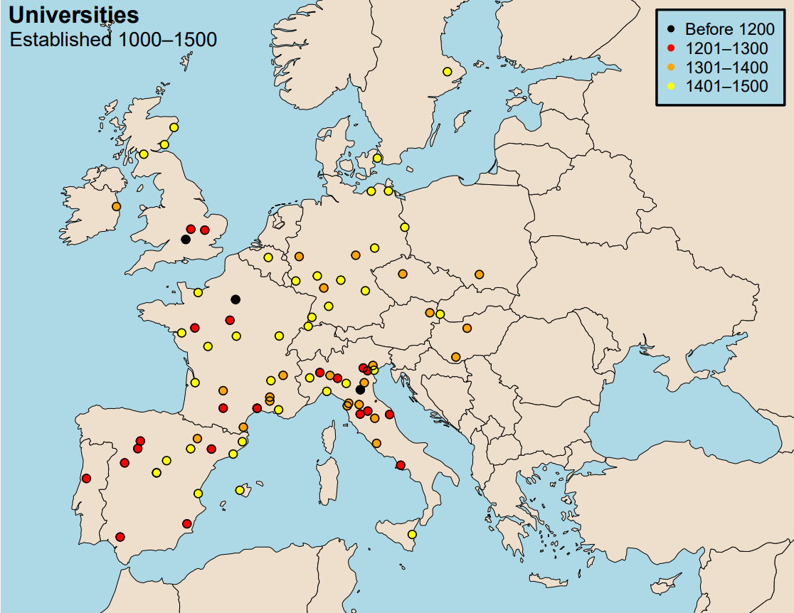 The geographical distribution of medieval universities together with their establishment period can be seen below. The underrepresentation of universities in East Europe is conspicuous. It is also evident that this development spread to the north somewhat later (e.g., Scandinavian universities in Uppsala, Sweden, 1477; Copenhagen, Denmark, 1479). The universities of the early period (prior to 1300) were established in Italy, France, Iberia, and England.