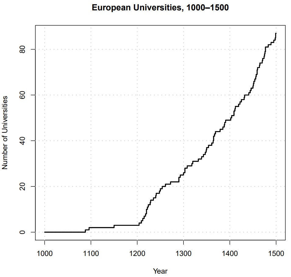 To look at the timeline more closely, below I have plotted the cumulative number of universities established throughout Europe between 1000 and 1500. While the earliest few are established before 1200, it is from the 1200s and forward that universities get established in great numbers. This is not long before the West European rise of notable people, the onset of which began around 1300 AD.