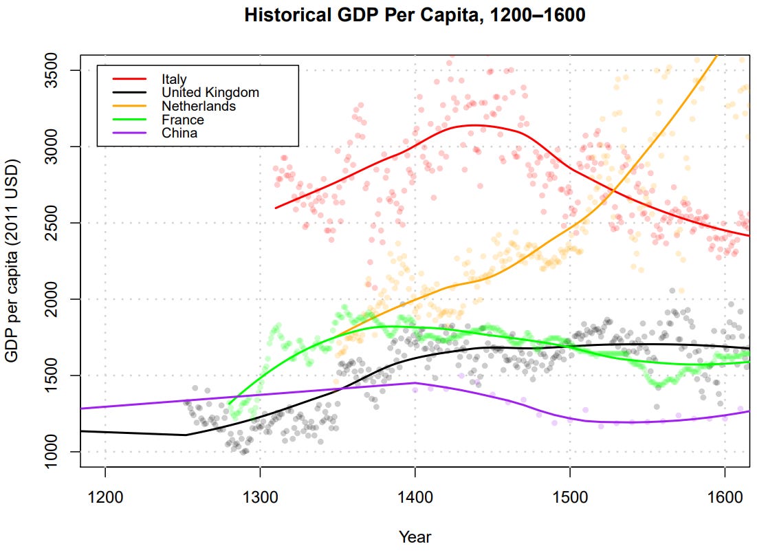 When West Europe overtook Chinese income levels, they became the richest major civilization in the world — India and the Middle East being both poorer than China on a per-capita basis.10 Above I have illustrated the per-capita GDP estimates of China and various West European countries for which good evidence is available. In 1300, Italy (or rather the Republic of Venice) was the richest nation by far. The United Kingdom, a late bloomer, still overtook China before 1400 AD. The Netherlands experienced the most explosive and persistent growth, and in the 16th century became the richest country — they have been described as “the first modern economy.” The North Sea area, including Britain and the Netherlands, would eventually be instrumental in the emergence of capitalism and the Industrial Revolution, resulting in unprecedented economic growth and creating the modern world as we know it.11