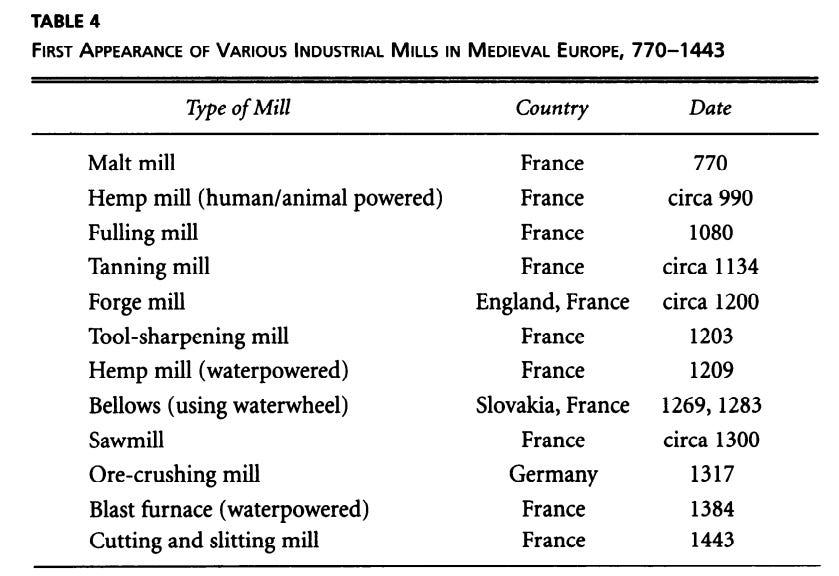 Adam Lucas (2005) identifies the first uses of various types of mills in medieval Europe, seen below. It illustrates the slow transition into partial mechanization in certain regions in Europe.