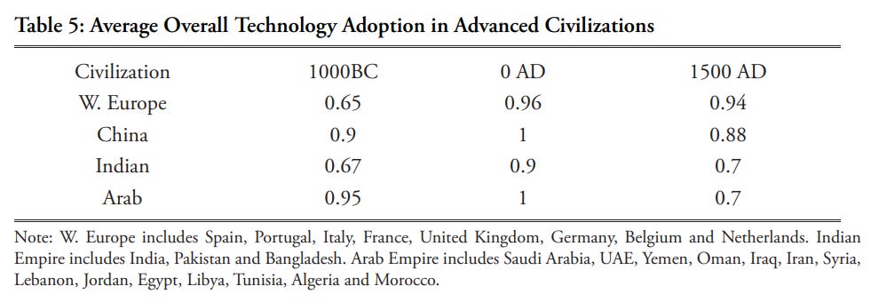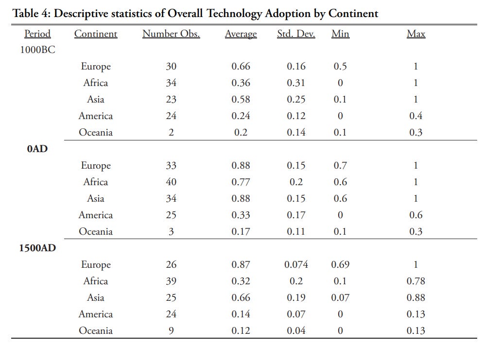 Easterly, Comin & Gong (2007) have assembled a dataset of national technology adoption in 1000 B.C., 0 A.D., and 1500 A.D., and from this developed measures of overall historical technological development of nations. For technological adoption by continent, they find that European nations on average had adopted most technology in 1500 A.D., with Asia taking the second spot (Table 4). Among advanced civilizations in 1500 A.D., West Europe had adopted the most technology and China second (Table 5).