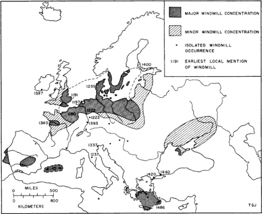 Windmills served various purposes, the most important being grinding grain for food. The windmill proliferated widely across medieval Europe, as illustrated below. The number of windmills perhaps numbered in the tens of thousands in Europe by the early fourteenth century. In England alone, an estimated 4,000 windmills had been built by 1300 (Langdon & Watts, 2005). In Braun & Hogenberg’s 16th century collection of city illustrations, the illustration of Copenhagen (from 1577-1578) includes 15 windmills.