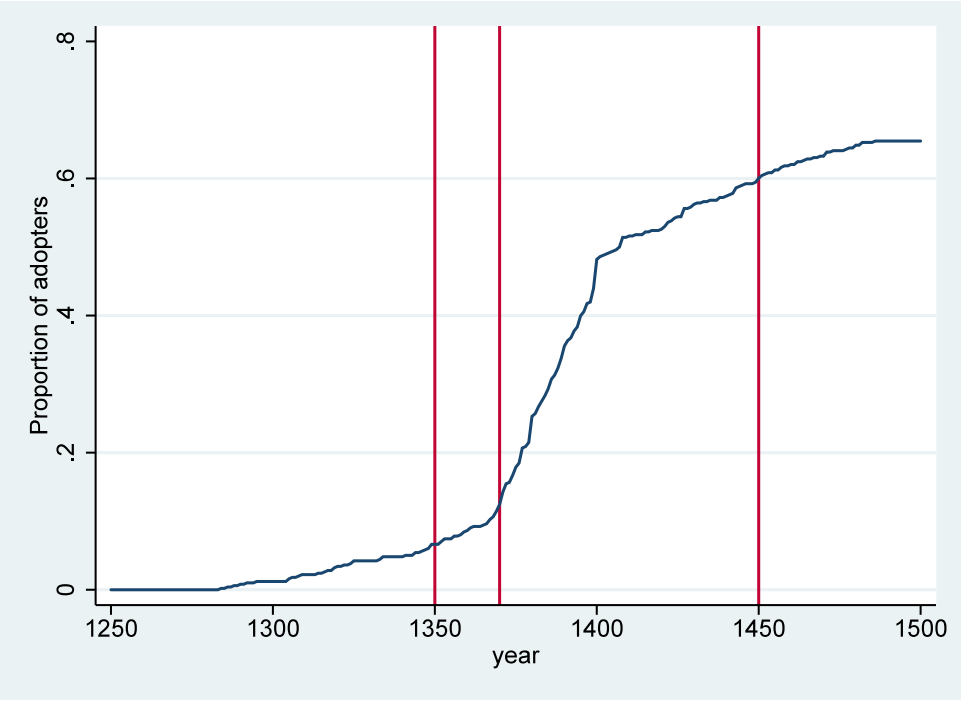 The cumulative adoption of the mechanical clock can be seen below. Mechanical clocks appear to have diffused most rapidly throughout Europe approximately between 1370 and 1400.