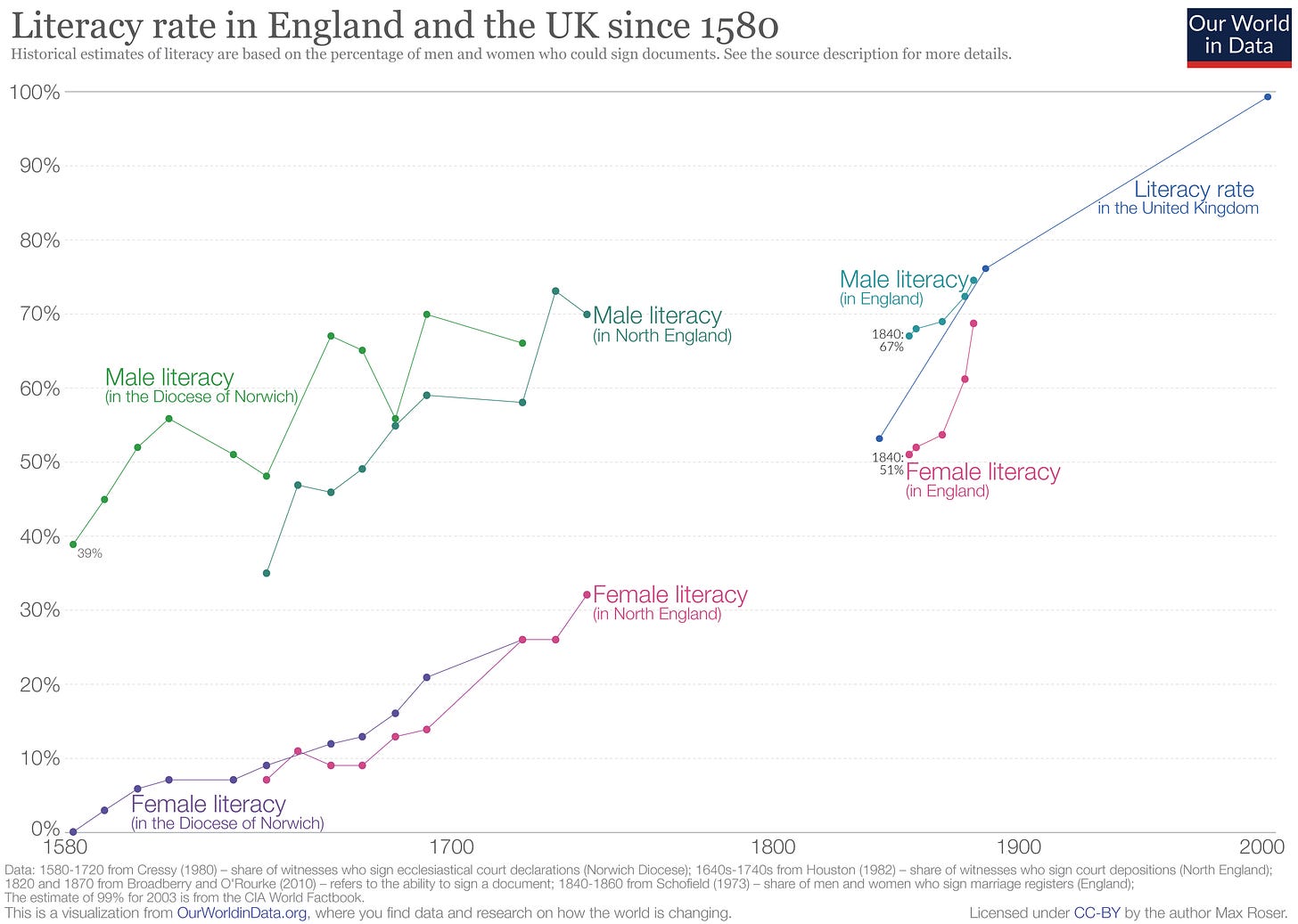 In the past, literacy was primarily reserved for rich and powerful learned men. But following the adoption of the printing press, and probably starting even earlier, literacy and numeracy rates began to increase, particularly in West Europe. The literacy rate in West Europe went from roughly 1 in 10 in 1500 A.D. to 1 in 3 in 1800 A.D. (Buringh & Van Zanden, 2009). The figure below illustrates estimates of historical literacy rates in the UK since 1580.