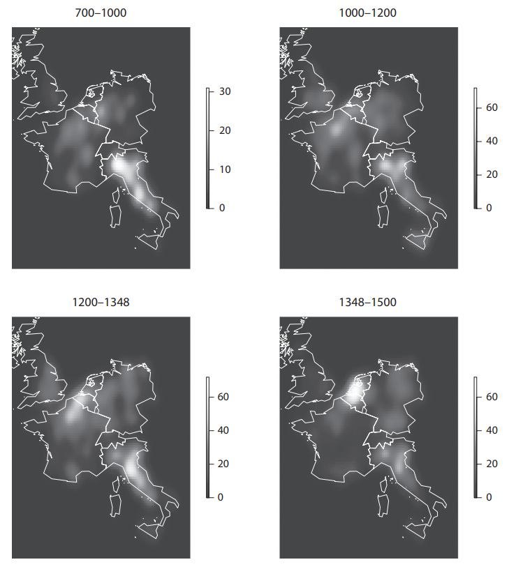The figure below illustrates quantitatively how North Italy dominated in church-building activity in the earlier periods, but the Low Countries eventually came to dominate. This pattern — the early Italian advantage followed by a transition into a Low Countries advantage — is replicated for several other developmental indicators, not least in my own analysis of notable people of science.
