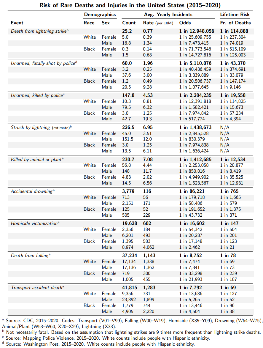 But most of the causes of death analyzed are very rare, most notably what inspired the analysis in the first place: over a lifetime, the risk of dying from a lightning strike is rarer than 1 in 100,000.