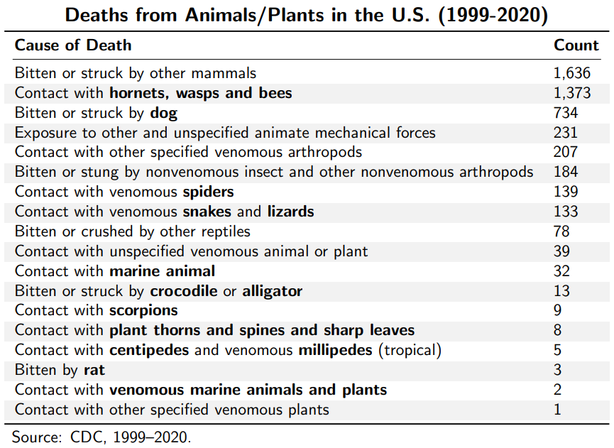 Every year in the United States, approximately 1 in 1.4 million person is killed by an animal or plant. The following table shows which animals are responsible.