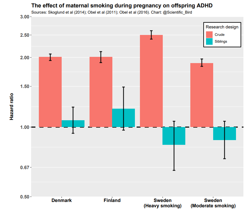 Researchers have used the same research design to assess the effect of maternal smoking during pregnancy on offspring ADHD (Skoglund et al., 2014; Obel et al., 2011; Obel et al., 2016). The figure below summarizes the results from three large Nordic studies. In none of the countries is the association significant between siblings within families. Again, the causal effect of maternal smoking on this psychological outcome appears minimal or null.