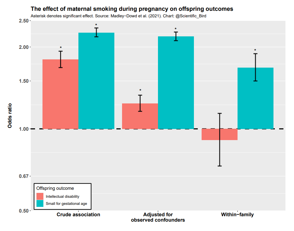 It is true that the persistence of an effect within families is not 100% proof of a causal relationship. The most pressing concern is if sibling differences confound the relationship between exposure and outcome. Suppose you want to know whether divorce causes suicide. A sibling difference in divorce (exposure) might be confounded by various sibling differences responsible for both divorce and suicide (e.g., differences in mental health). But in our maternal smoking example, as the exposure affects them before they are even born, this is less of a concern. Furthermore, while I have just discussed one research design, the proposition that maternal smoking affects birth weight is supported by a wide range of other research designs (see textbox 3, Krieger & Smith, 2016). Thus, it is most reasonable to conclude (based on the weight of the evidence) that there is a causal effect of maternal smoking on birth weight.