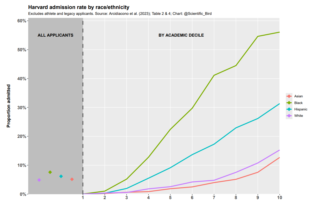 In fact, Arcidiacono et al. (2022) have shown that “Harvard encourages applications from many students who effectively have no chance of being admitted, and that this is particularly true for African Americans.” The racial bias in the unadjusted admission rates was thus masked by the inclusion of students who had no chance of being admitted, so Harvard could admit other students (who would not have been admitted absent preferences).